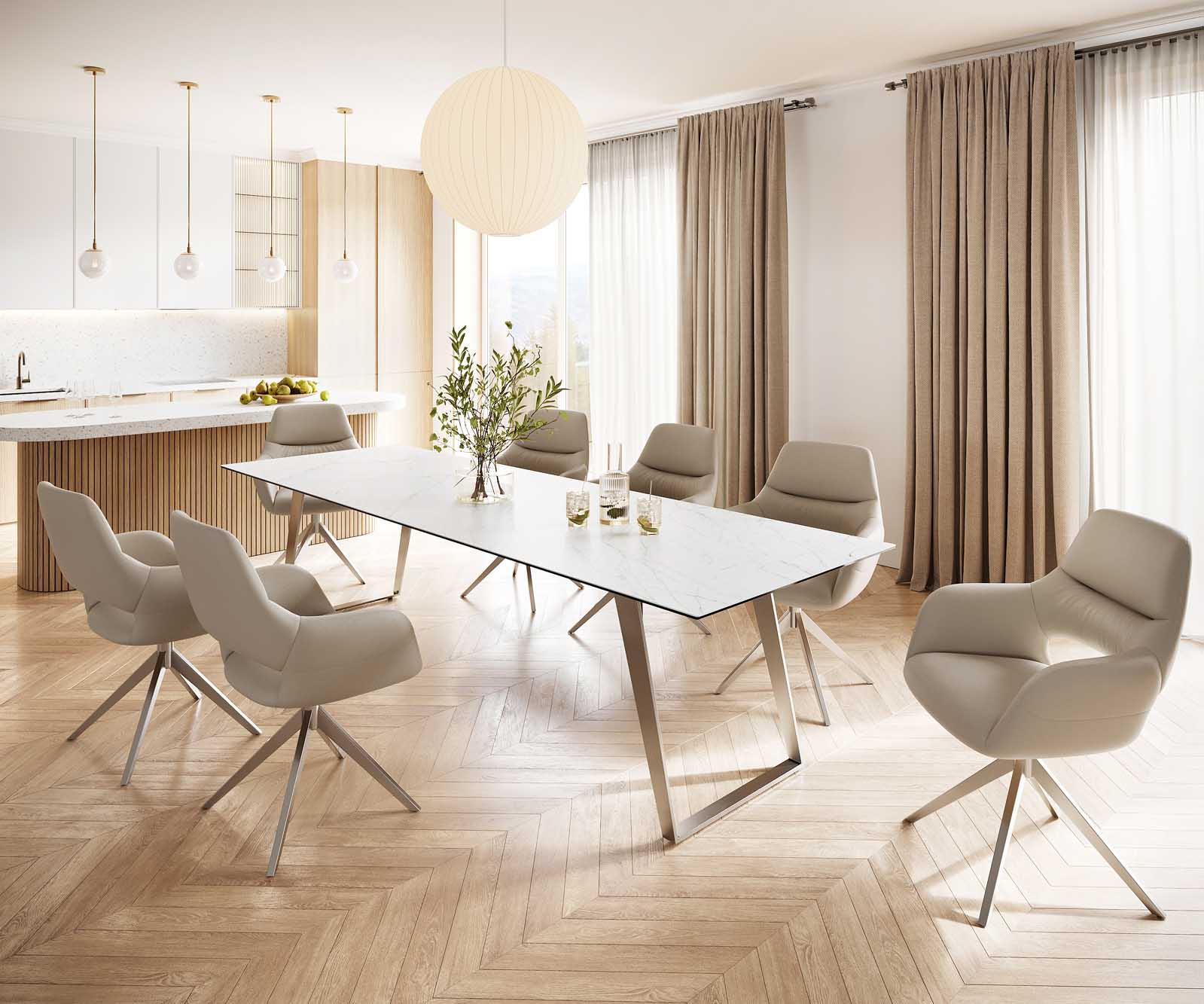 Het lineaire design van het rechthoekige kruisframe past perfect bij het design van het tafelblad, dat een praktische uittrekfunctie heeft. Het zorgt voor een aantrekkelijk totaalbeeld dat pure elegantie en helderheid uitstraalt. Het frame met zijn hoekige randen is gemaakt van hoogwaardig, gepoedercoat metaal, dat bekend staat om zijn uitzonderlijke veerkracht en lange levensduur. De matzwarte kleurstelling accentueert de tint van het op stralende wijze. Hierdoor wordt de Edge-tafel een stijlvol middelpunt van uw vier muren en zal ook uw gasten zich deze tafel op indrukwekkende wijze herinneren.